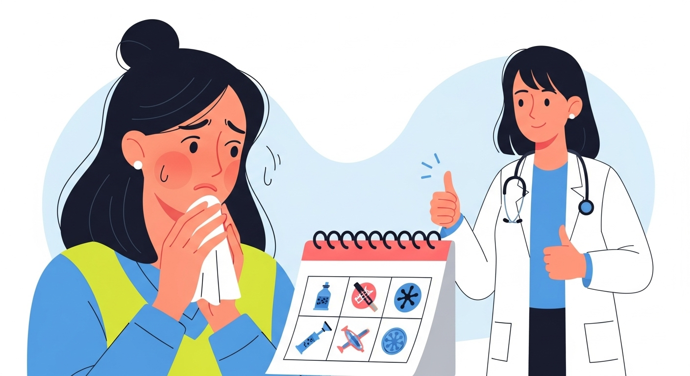 가장 대표적인 것은 앞서 여러 번 강조한 37.5℃ 이상의 발열입니다. 체온계의 숫자가 이 이상을 가리킨다면, 즉시 예약을 변경하고 휴식을 취하세요. 둘째, 심한 기침과 가래, 호흡 곤란입니다. 단순한 상기도 감염을 넘어 폐렴이나 기관지염 등 하기도 감염으로 진행되었을 가능성이 있으며, 이는 예방접종의 심각한 금기 사항입니다.