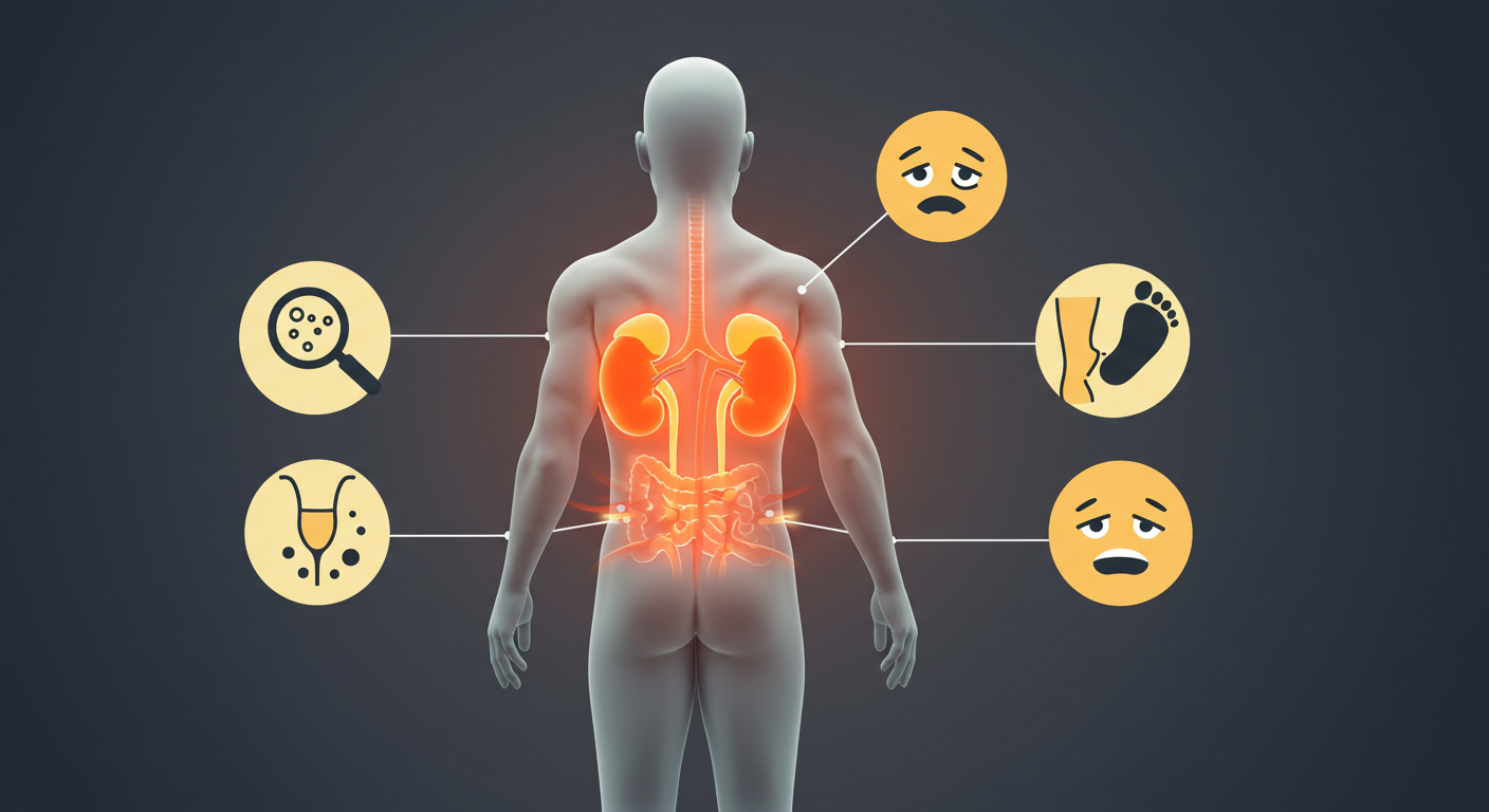 신장 기능 저하의 대표적인 증상들을 아이콘과 함께 쉽게 이해해 보세요. 이 증상들은 단순히 피곤해서 생기는 것이 아닐 수 있습니다.